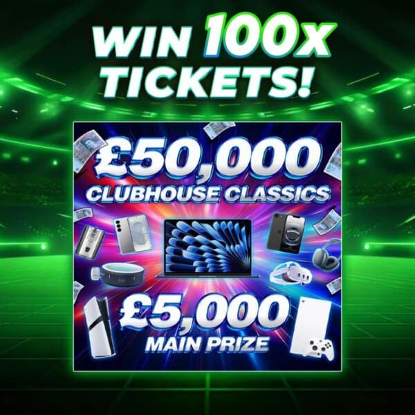 YOUR 20p COULD BRING YOU 100 TICKETS INTO OUR £50,000 CLUBHOUSE CLASSICS! THAT MEANS 100 CHANCES TO FIND AN INSTANT WIN + 100 CHANCES TO WIN THE £5,000 JACKPOT 🤩